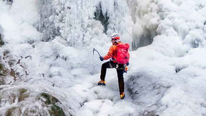 A daring individual has successfully climbed a magnificent frozen waterfall in a national park amidst the ongoing frigid Arctic weather in Britain.